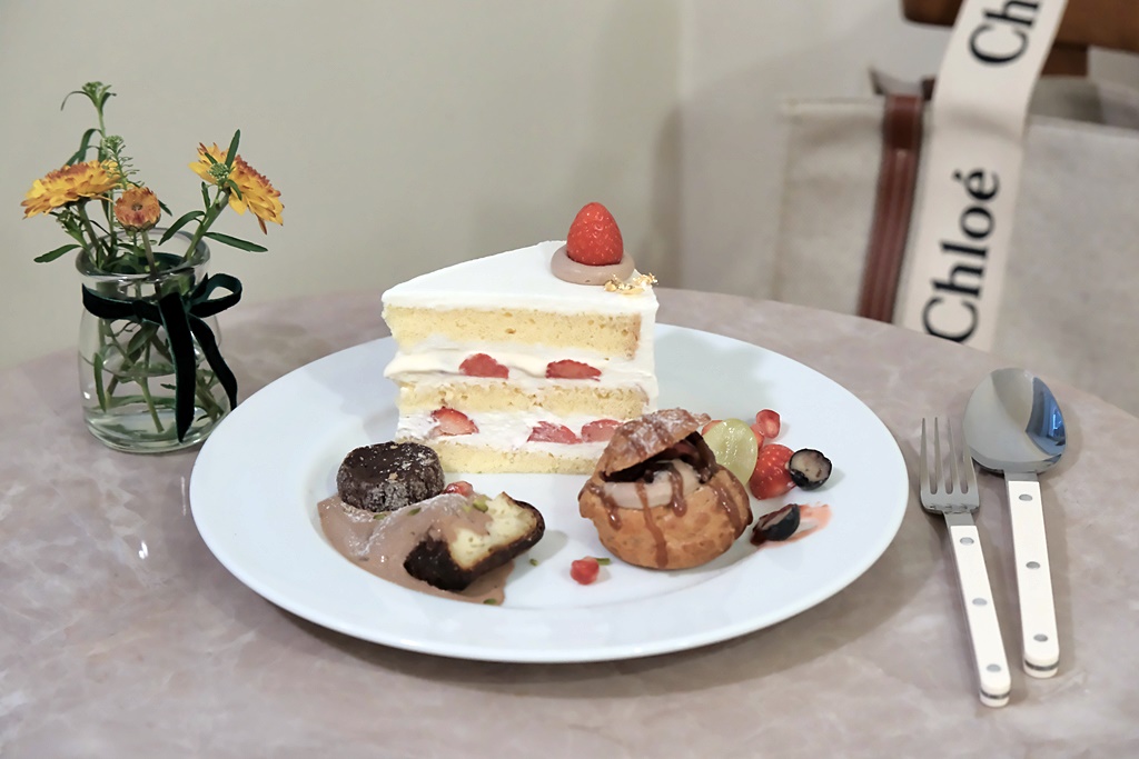 拼盤以蛋糕為主,搭配店家設計的小點心作為拼盤,當天蛋糕有草莓和巧克力兩種口味可選,使用當週採購的新鮮水果和食材,加上來自法國、日本、台灣等食材製作出盤上的甜點,每道甜點都是手工製作,順序從蛋糕、泡芙、可麗露吃到餅乾,層層堆疊的美味,我覺得他們的甜點越來越有質感了,大推草莓蛋糕,細緻的蛋糕體搭配滑順不甜膩的鮮奶油,好吃到不行呀!我最愛的可麗露只有1/4個,完全吃不夠哈哈,後來跑去問闆娘有沒有可麗露能外帶?幸好還有最後兩顆,直接包軌