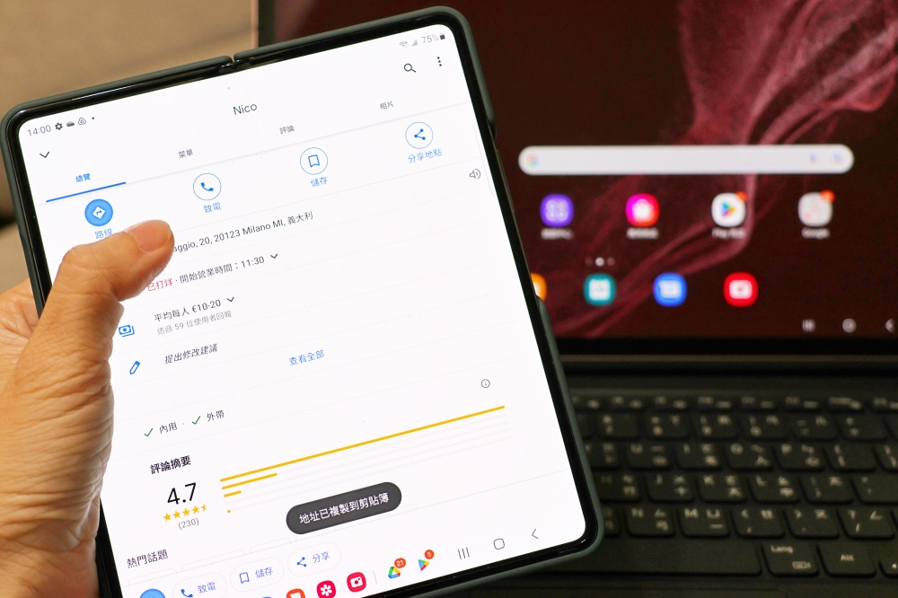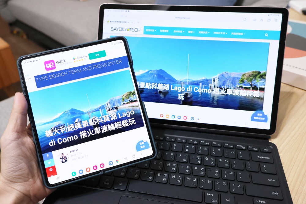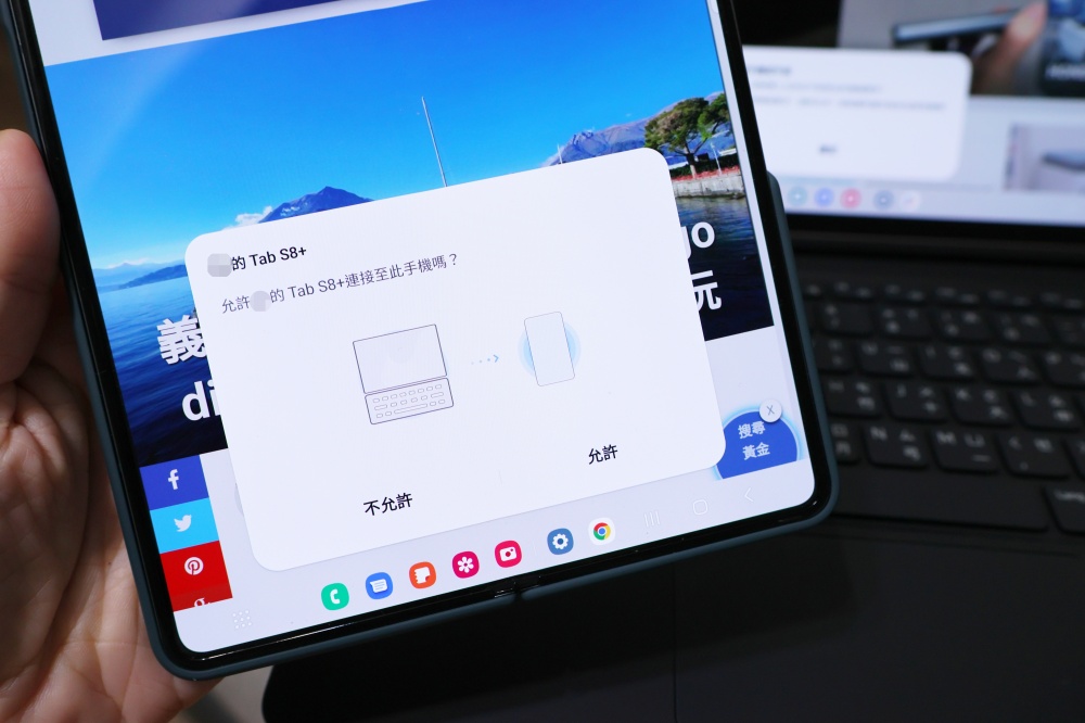 或是說剛剛搭車時看到了很值得參考的遊記,雖然 Galaxy Z Fold4 的螢幕已經超大很適合瀏覽了,但若是想要用更大螢幕的平板觀看,只要打開平板,Galaxy Tab S8+ 就會跳出訊息詢問「透過手機繼續」,點一下訊息後,Galaxy Tab S8+ 就會開啟內建的瀏覽器,讓我繼續瀏覽剛剛看到一半的網頁。
