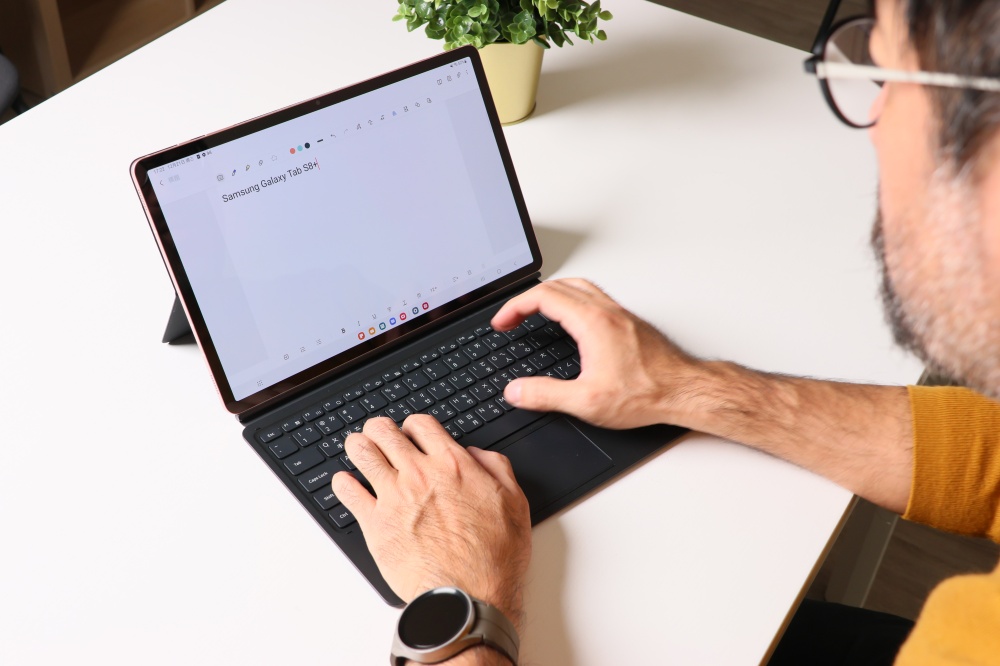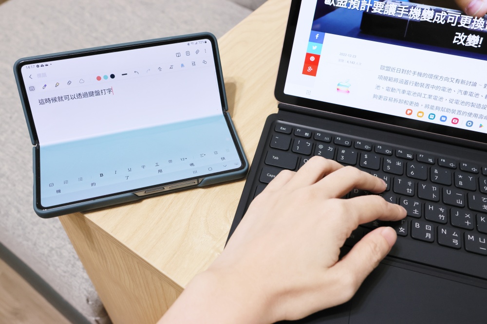 不只應用程式可以跨裝置接續,還要跟大家分享一個實用密技,那就是可以應用 Galaxy Tab S7 / S8 系列旗艦平板搭配的鍵盤,透過「無線鍵盤分享」功能,讓鍵盤可以直接支援 Galaxy 手機文字輸入,這樣可以大大的提高打字效率。