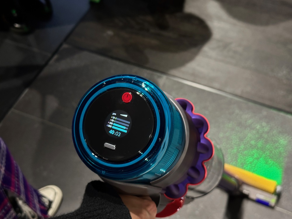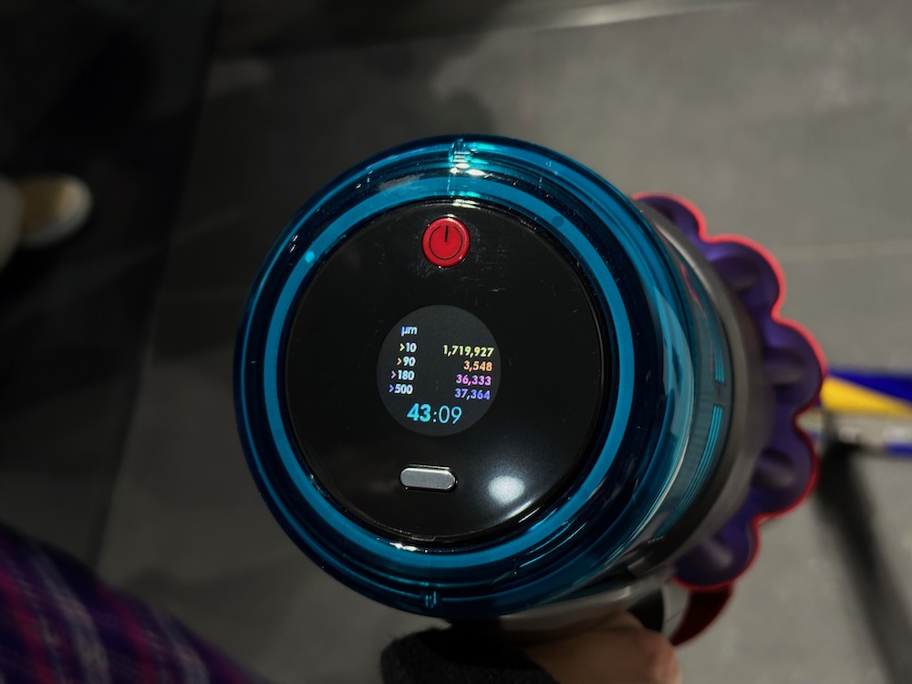 LCD 螢幕上方也同時在利用壓電式聲學感應技術實現即時灰塵分類統計,使用者數據顯示介面也經過全新設計,可以即時動態回饋灰塵資料和地面清潔程度。啟動機器的時候,LCD 螢幕會顯示 4 種尺寸的顆粒物,這些橫條圖會根據捕捉顆粒物的濃度變化,來即時伸長或縮短,為用戶清潔提供指引