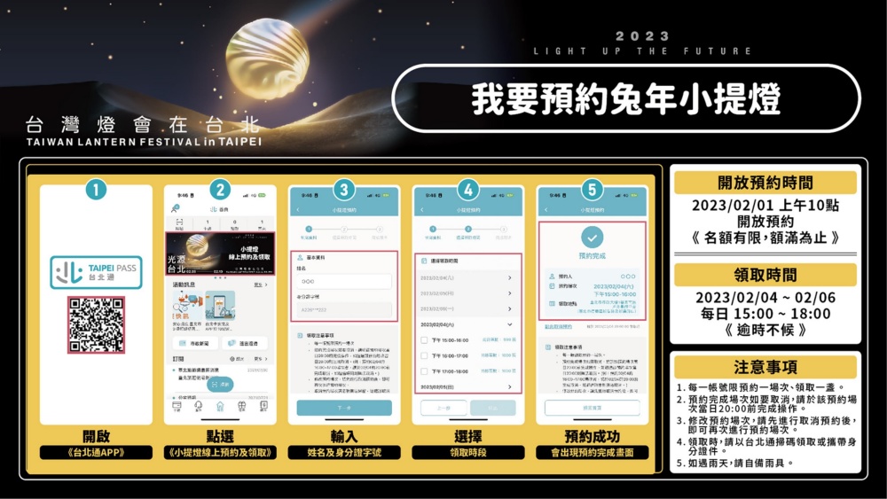 今年為了讓大家更方便能夠領取到兔年小提燈,台北市政府提供三種方式,包含線下 14 個實體發放點,以及線上網頁與台北通 App 的預約方式,目前看起來想要保證領到又不想太麻煩,下載台北通 App 並事先註冊會員會是相對方便的方式,不過無論是使用哪一種預約方式,都必須要親自到台北市政府 1 樓領取,並且要請記得攜帶證件或是用台北通掃碼確認預約。