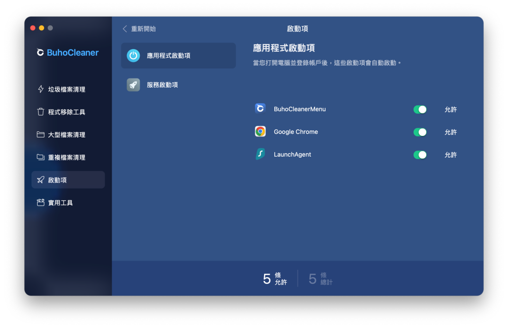 雖說 Mac 使用者有很高比例的人不會將電腦關機,但如果還是每天開關電腦的話,可以透過 BuhoCleaner 裡的啟動項來看看,當打開電腦時有哪些應用程式會自動啟動,如果覺得開機速度慢,很有可能就是開電腦時要啟動的應用程式太多,導致拖垮了速度。