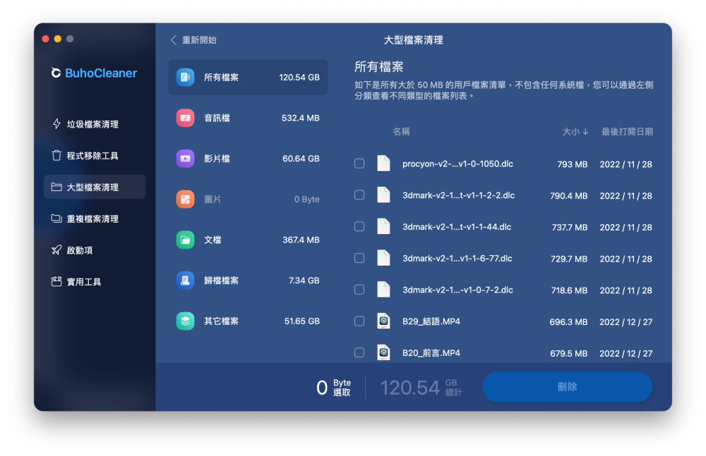 若是空間沒那麼捉襟見肘,只是想要整理掉不常用的大型檔案的話,可以使用大型檔案清理工具,可以自動刪選出儲存空間裡大於 50MB 的檔案,並且依照音訊、影片、圖片、文件等不同類型的檔案為使用者分門別類,輕鬆整理掉那些佔據空間的肥胖檔案們。