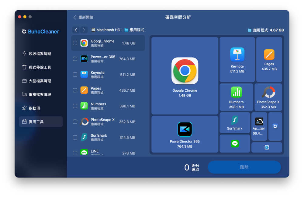 以我的應用程式使用狀況來說,Chrome 真的好肥大,佔了 1.48GB 空間,常用的 Keynote、Pages、PowerDirector 365 則不到 1GB,意外的還算省空間。