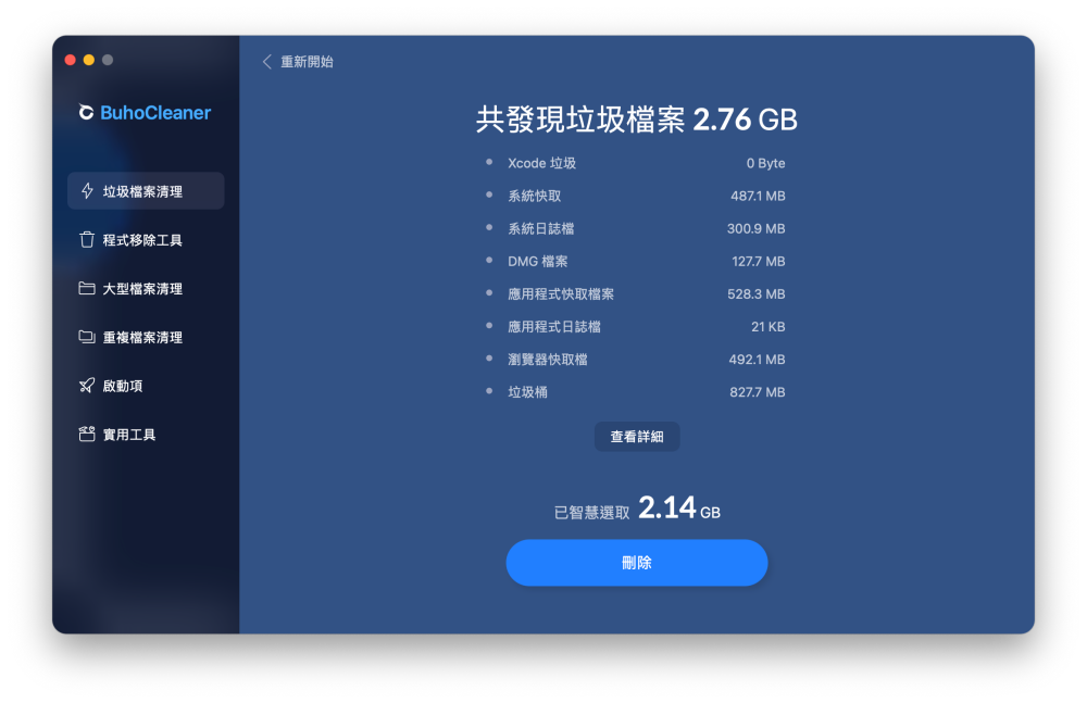 掃描完成之後會列出各種可能可以刪除的垃圾檔案,老實說筆者這台電腦才剛買三個月而已,想不到就已經有 2.14GB 的垃圾檔案可以刪除,BuhoCleaner 會聰明的「智慧選曲」那些刪除也不影響使用者的檔案來刪除,像是瀏覽器的快取、應用程式的快取等等,但如果想要自己決定哪些內容要刪除的話,可以點選「查看詳細」選項。