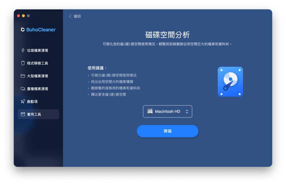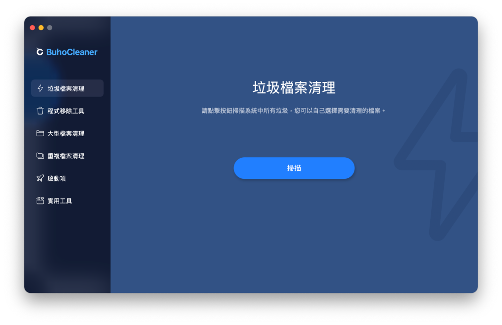 BuhoCleaner 介面設計的非常簡約,啟動後左側為功能列,提供垃圾清理、程式移除、大型檔案清理、重複檔案清理、啟動項以及實用工具,初次啟用時會需要允許硬碟存取權限。