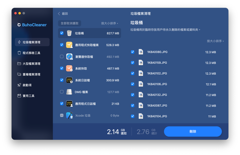 點選「查看詳細」的選項,就會看到 BuhoCleaner 幫忙找出來的垃圾檔案內容有哪些,還會詳細地列出檔名、容量大小供使用者知道到底是哪些東西佔據了儲存空間,若是要刪除的話直接勾選要刪除的內容,按下「刪除」就可以快速清理不要的資料了。