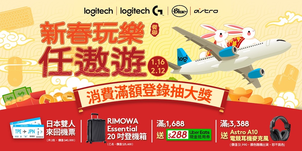 即日起至 2 月 12 日,消費滿 990 元至指定頁面登錄發票,就有機會抽中日本雙人來回機票(價值 40,000 元) 及 Rimowa 20 吋登機箱 (價值 25,600 元)等大獎。消費滿 1,688 元就送 Uber Eats 288 元抵用券,滿 3,388 元送價值 1,990 元 Astro A10 電競耳機麥克風 (與 Uber Eats 抵用券二擇一)。線上消費滿 1,688 元或於實體門市消費滿 990 元,再送 Logitech 兔年限定繽紛紅包袋。