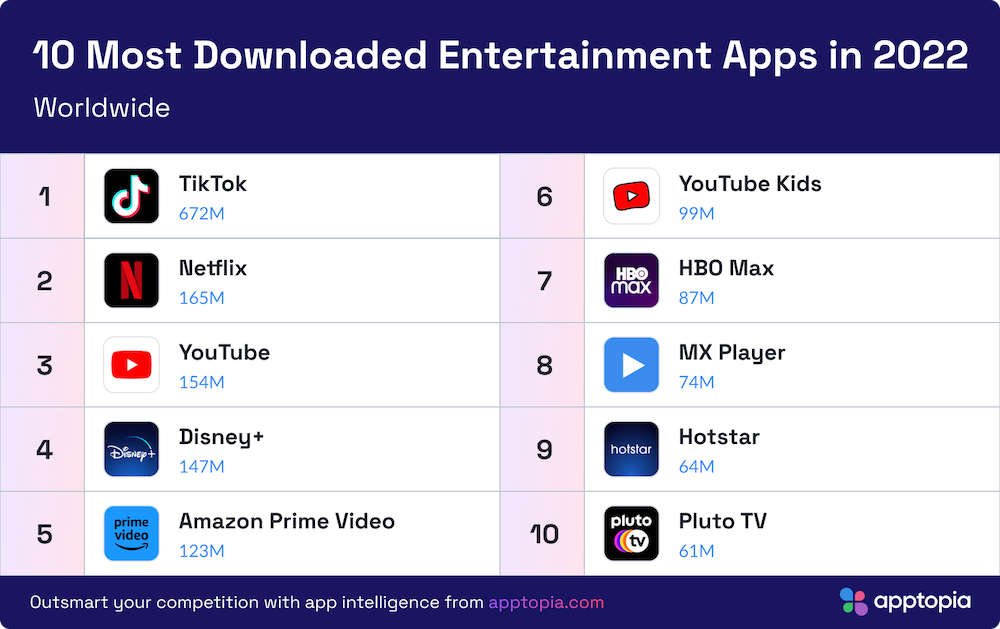 2022 年全球 app 下載次數前 10 名分別為「TikTok」6.72 億次、「Instagram」5.48 億次、「WhatsApp」4.24 億次、「CapCut」3.57 億次、「Snapchat」3.3 億次、「Telegram」3.1 億次、「Subway Surfers」3.04 億次、「Facebook」2.98 億次、「Stumble Guys」2.54 億次、「Spotify」2.38 億次。其中第 7 名的 「Subway Surfers」與第 9 名的 「Stumble Guys」更是首次進榜的遊戲 app,取而代之跌落榜外的是「Zoom」與「Facebook Messenger」2 款軟體。