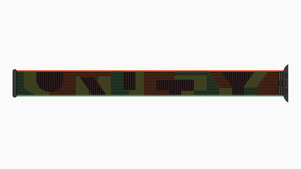 Black Unity 運動型錶環以紅色、綠色和黑色紗線將抽象風格的「Unity」字樣編織進錶帶中,致敬泛非旗幟,而並排編織的紅色和綠色紗線創造出黃色的錯覺。