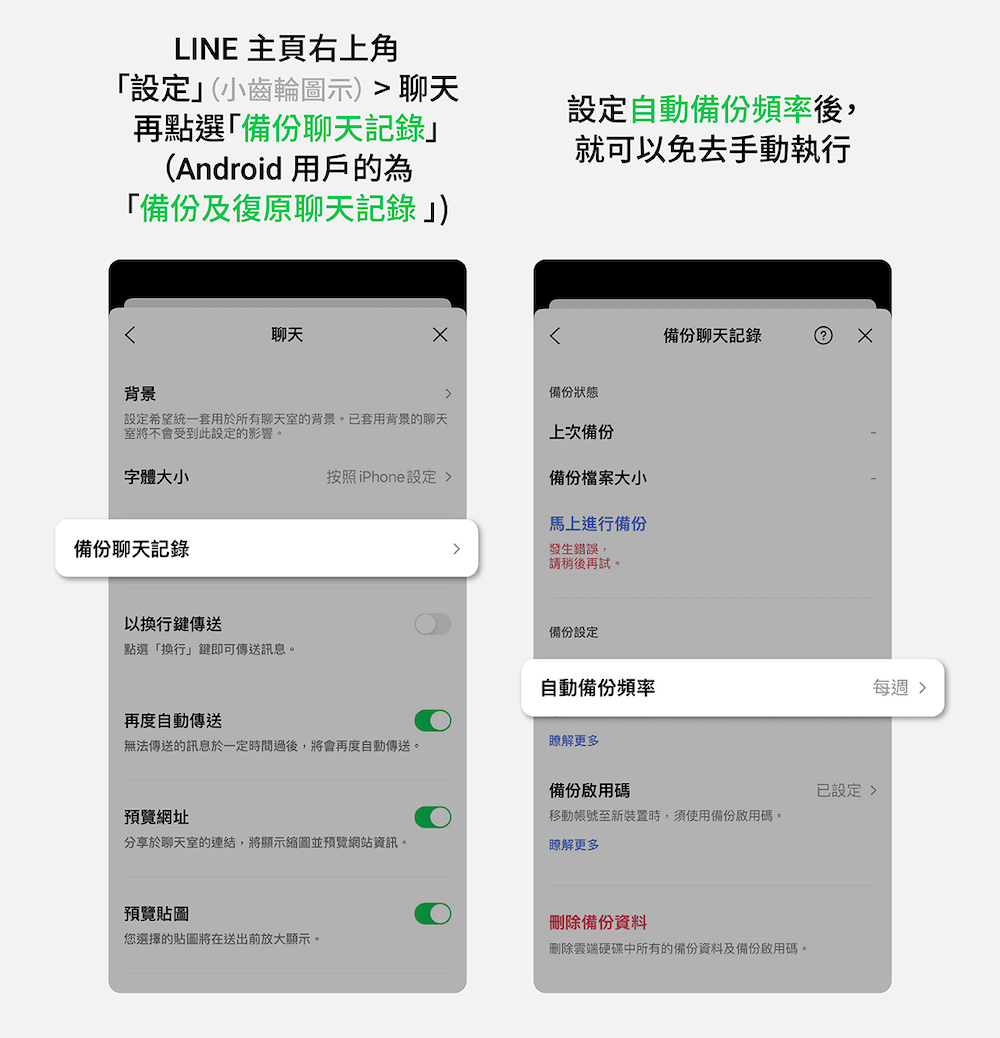 - 路徑: LINE 主頁右上角「設定」(小齒輪圖示)> 聊天 > 備份聊天記錄/備份及復原聊天記錄 > 自動備份頻率
