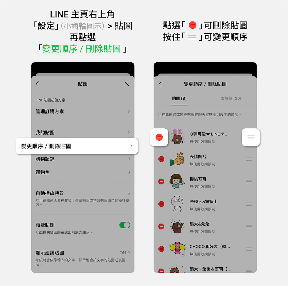 - 路徑:LINE 主頁右上角「設定」(小齒輪圖示) > 貼圖 > 變更順序 / 刪除貼圖