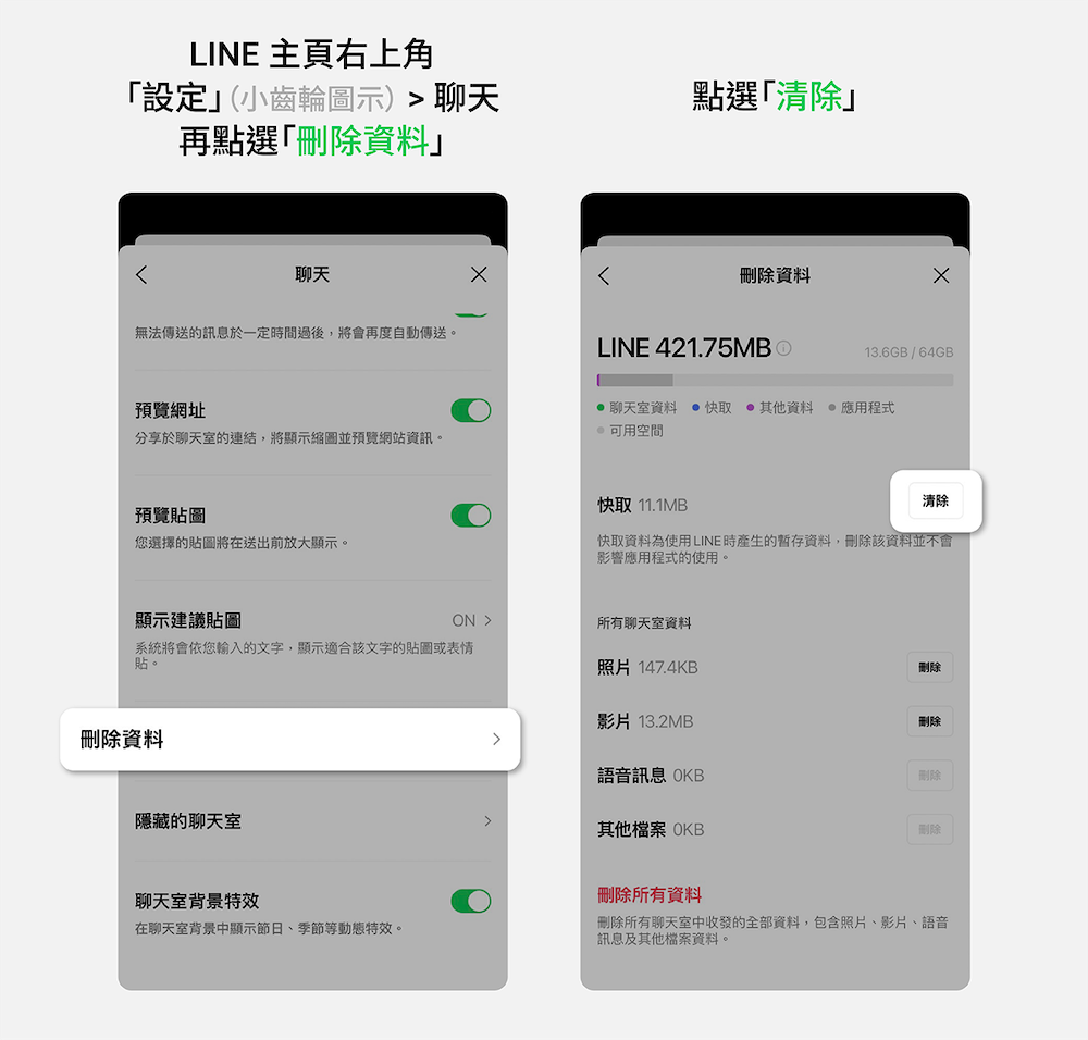 - 路徑:LINE 主頁右上角「設定」(小齒輪圖示)> 聊天 > 刪除資料 > 清除