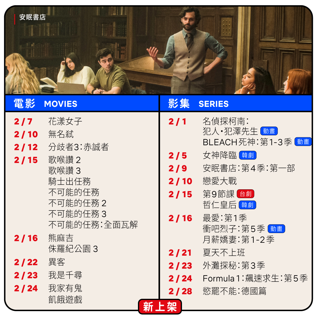 春節假期把想看的劇都追完了嗎? Netflix 公布 2 月新上 / 下架片單,有《安眠書店:第 4 季》、《外灘密探:第 3 季》、《飆速求生:第 5 季》等多部影集續集開播之外,還有《歌喉讚》、《不可能的任務》等系列電影,以及《月薪嬌妻 1-2 季》也都即將上架,又可以重刷經典好劇!