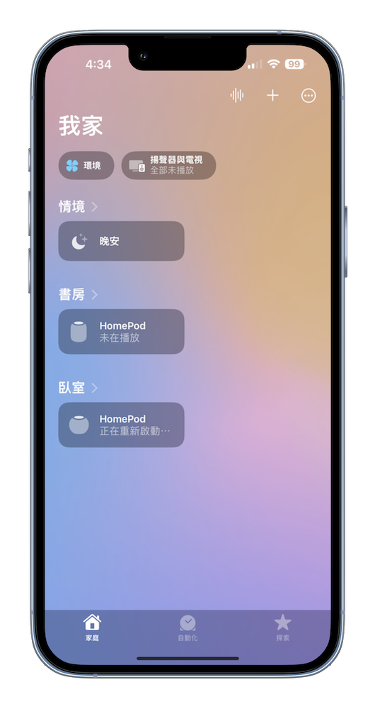 目前 HomePod 家族中支援溫濕度感測的機種為 HomePod mini 與即將開賣的第二代 HomePod,如果有朋友在第一次溫濕度感測時一直卡在「校正中」,能夠藉由「家庭」首頁中點選卡住的裝置,再滑到最下方「重置 HomePod」來「重新啟動 HomePod」。