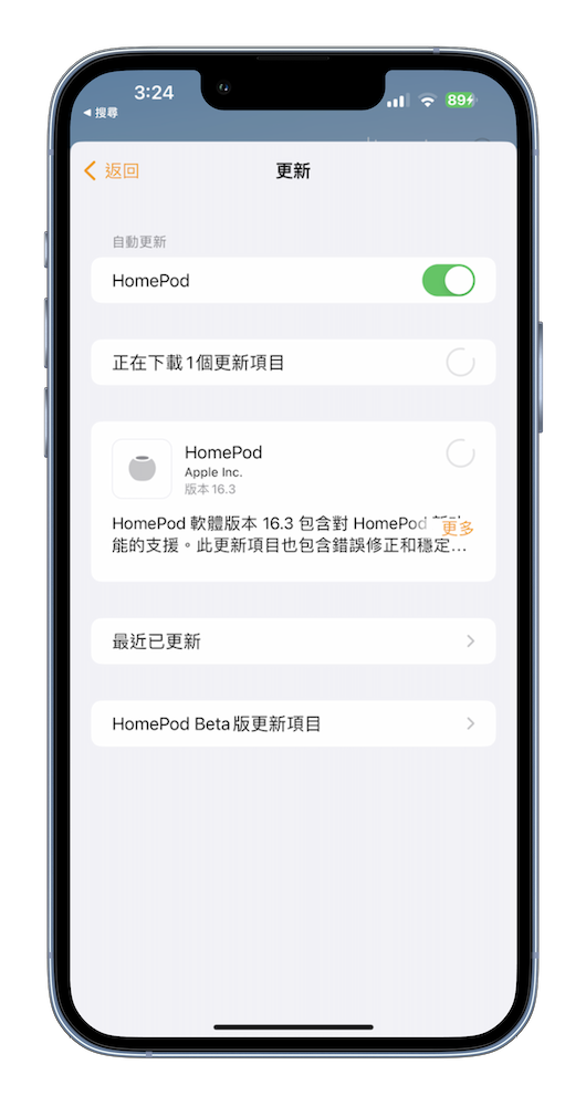 想要使用 HomePod mini 溫度與溼度的感測功能時,我們必須先將手上的 iPhone 與 HomePod mini 雙雙更新到 16.3 版本。iPhone 軟體更新的方式相信大家都很熟悉了(iPhone 上的「設定」 >>>「一般」>>>「軟體更新」),這邊我們就直接從 HomePod mini 的更新開始。