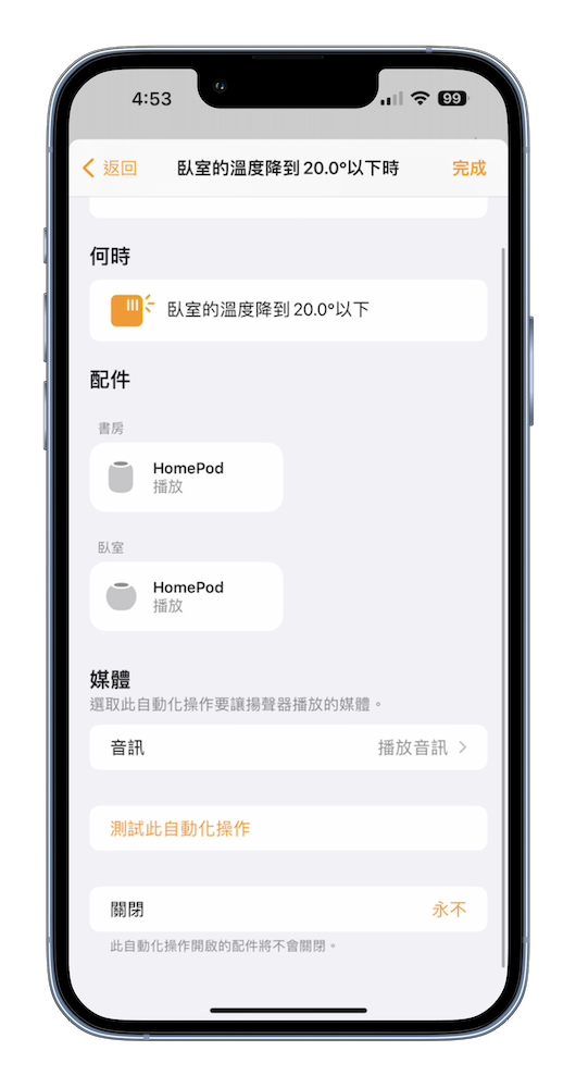如果在「家庭」中還有其他的智慧家電,甚至還可以藉由「自動化」中的「新增自動化操作」>>>「感測器偵測到變化時」來做連續動作設定,像是當濕度到達 70% 時自動啟動除濕機、溫度低於 20 度開啟暖氣等。