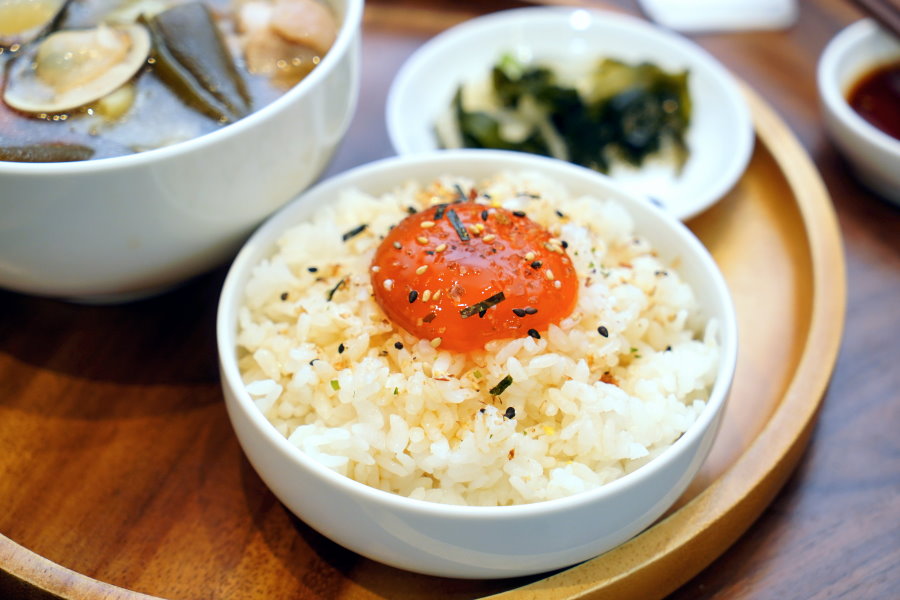 ▼卵黃米飯(+20元),看起來好像太陽蛋的造型,其實就是白飯上多加了一顆半熟蛋黃,再搭配香鬆、醬料讓整體吃起來更有層次!