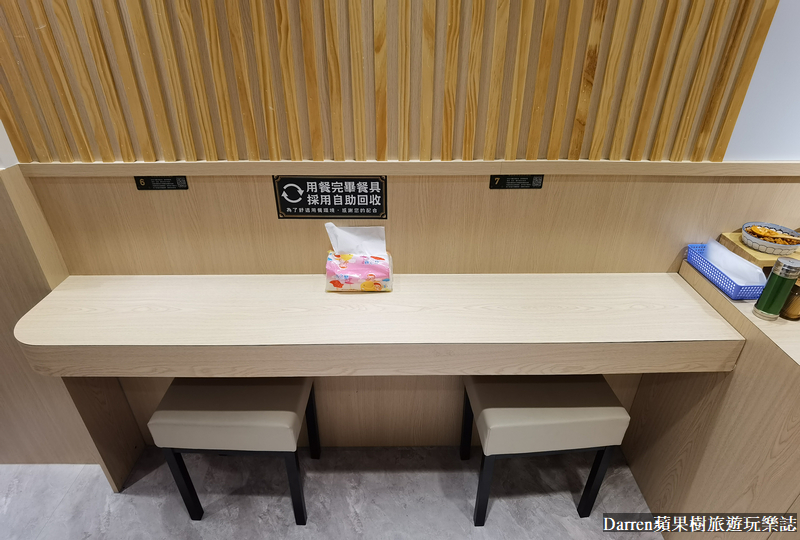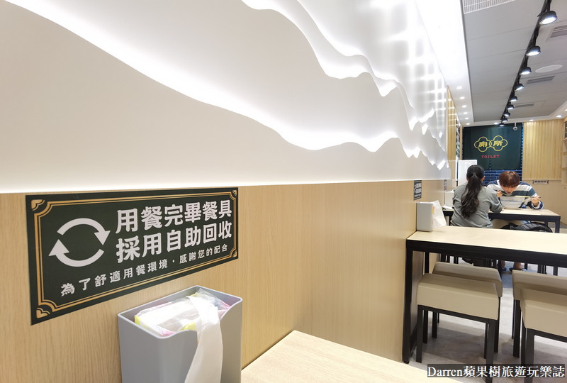 座位區以4人桌為主,一個人吃用餐也有吧台單人桌可以使用,進到店內如果選擇內用,就會有店員幫忙安排座位,這裡用餐完畢採用自助回收,記得把餐具放到回收區就好