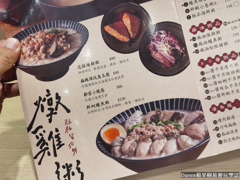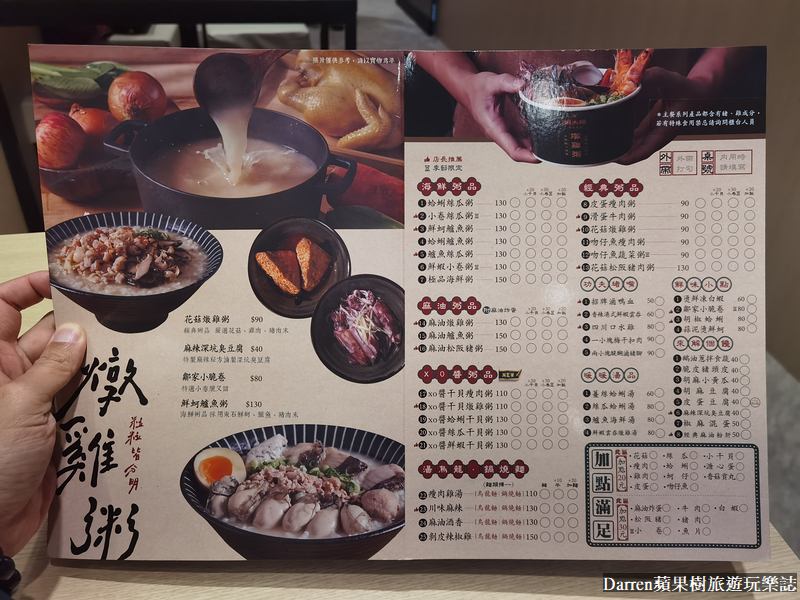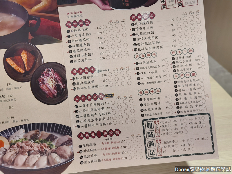 粥大福菜單,內容多達20多種粥品、麵食以及小菜等,價格在40到150之間,粥大福粥品比較屬於台式鹹粥,主打以鮮蔬和雞骨長時間慢煮而成的福氣雞湯下去熬粥,我覺得他們家的粥品,有種雞湯雜炊的概念,配料還可以依喜好來搭配變化加料