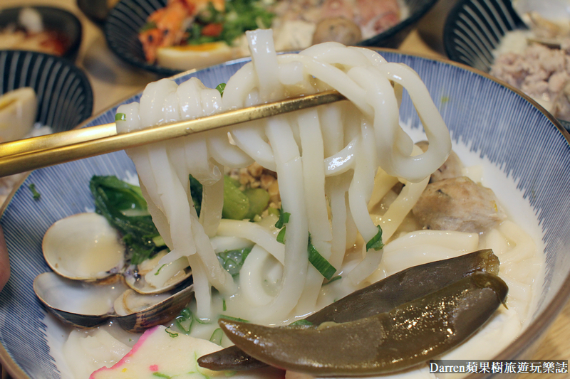 如果想要吃麵我推薦這碗剝皮辣椒雞烏龍麵,麵類可以選擇烏龍麵或鍋燒麵,而粥大福的烏龍麵是使用日本讚岐烏龍麵,湯頭則是以雞湯為基底,裡面還分別有豆腐、蛋、香菇貢丸、蛤蜊、剝皮辣椒等等
