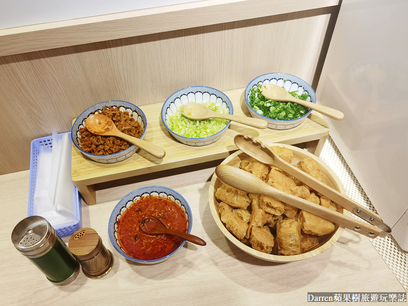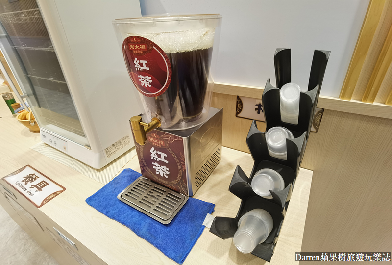往後面走除了有餐具回收區之外,也有自助吧區可以使用,像是油條、蔥花、芹菜、辣椒、辣菜脯等等都可以自行取用,另外還有復刻古早味紅茶免費喝到飽