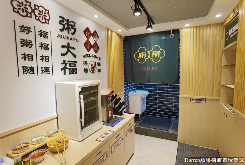 走進粥大福桃園大溪店,除了以綠色為主色系的店面,很不像賣粥的之外,進到裡頭的日系暖色調裝潢風格,也完全跳脫出我的粥店的刻板印象,桌間距離寬敞光線明亮,整體氛圍帶點溫馨的感覺