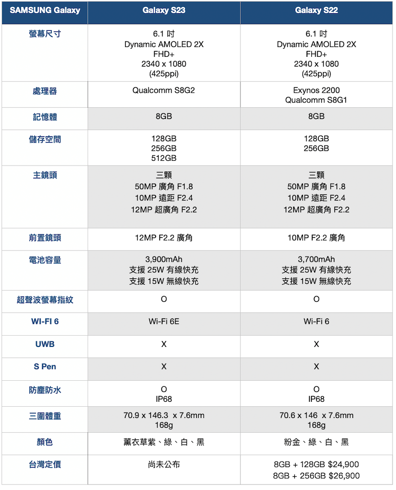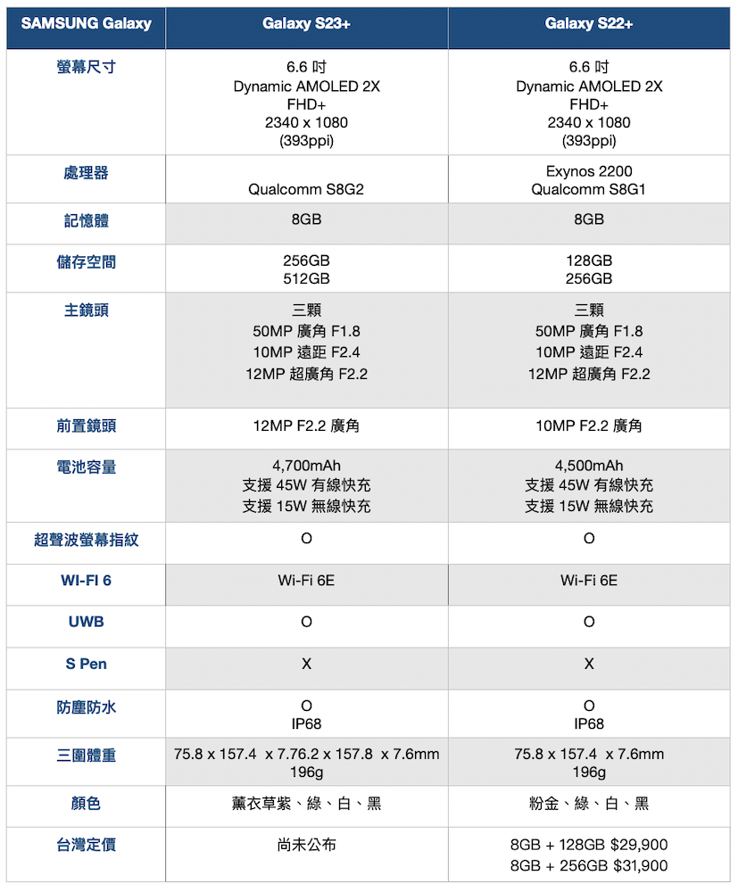 三星 Galaxy S23 / S23+ 特色與前代規格比較整理