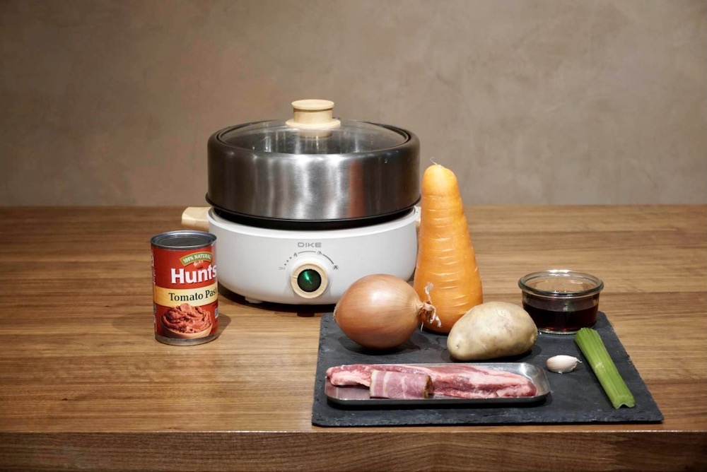 步驟:牛肉適口大小、西芹、紅蘿蔔與洋蔥切塊,將備好食材倒入450ml紅酒冷藏醃一晚上;隔天取出牛肉吸乾水分,以不鏽鋼鍋倒入適量橄欖油,將牛肉煎上色後,加入一些玉米澱粉/麵粉,並將剩餘食材倒入,加一點蕃茄配司,加入500ml高湯,大火滾後轉中火燉煮1.5~2小時,撈去表面浮沫,牛肉軟嫩狀態就可以把肉跟紅蘿蔔夾出,蔬菜撈掉,此時將馬鈴薯切塊,與培根放入鍋中燉煮收至湯汁濃稠,再將牛肉、紅蘿蔔放入鍋中加熱五分鐘完成。
