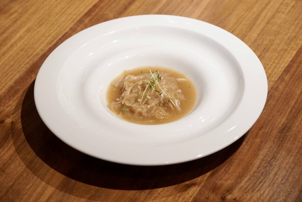 步驟:切洋蔥絲,大蒜切片,在不鏽鋼鍋加入適量橄欖油、糖,並以大火翻炒,洋蔥炒至深褐色,之後加入少量麵粉,接著加入高湯、調味料、紅酒大火燉煮,燉煮到濃稠即可享用。