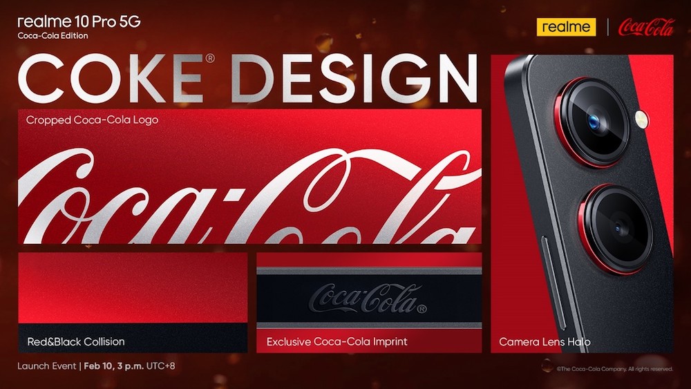 realme 10 Pro 5G Coca-Cola Edition設計靈感源自可口可樂的經典印象,以三分黑七分紅的不對稱撞色設計,可口可樂經典的正紅色映入眼簾,給人一種積極、年輕、精力充沛的感覺。同時將經典的Coca-Cola標誌大膽改造,裁剪後的可口可樂標誌為手機注入了新的活力。