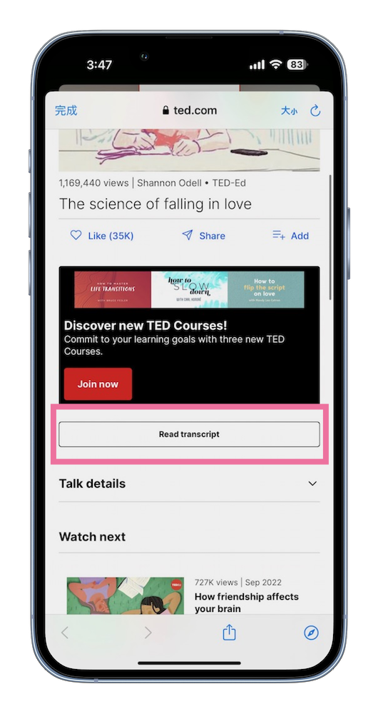 在網頁中往下滑,如果有看到「Read transcript」的選項就能夠點選下去。但如果沒有出現「Read transcript」,但右上已經有出現「大小」,那麼可以直接跳到下一步試試看。