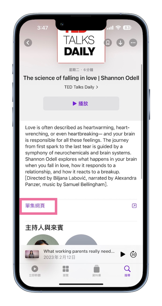 步驟 1. 在 Podcast 中打開喜歡的節目,接著在下方選擇「單集網頁」。