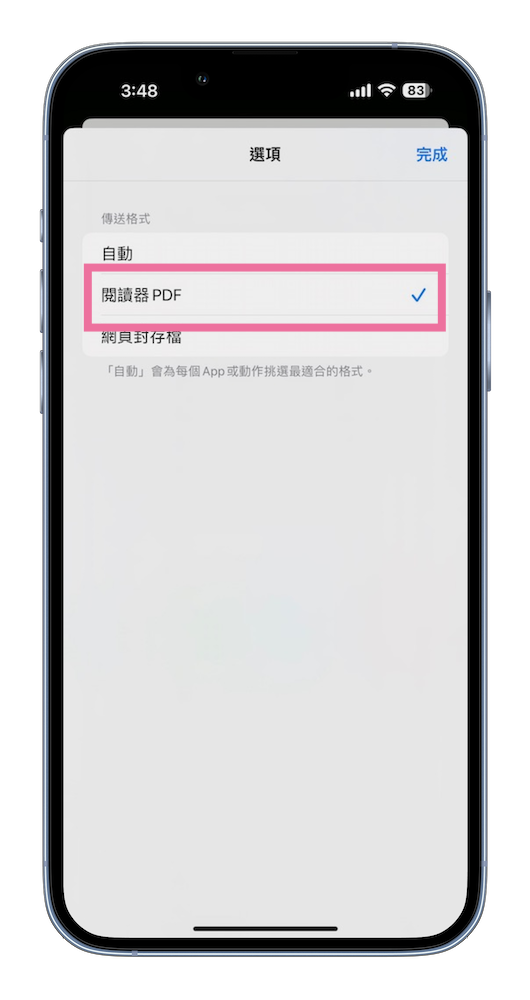 步驟 4. 此時點選下方的「分享」後,在「選項」中切換成「閱讀器 PDF」,便能看見「儲存到檔案」的選項,這時就能將這集的文字腳本儲存到檔案中。