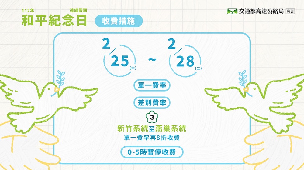 (三) 暫停收費:112 年 2 月 25 日至 2 月 28 日,每日 0 至 5 時國道全線暫停收費。