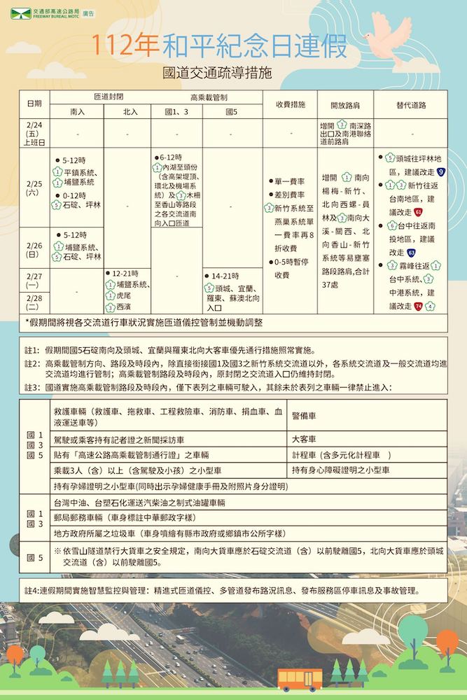 2023 228連假國道交通懶人包:高乘載管制、匝道封閉、收費措施