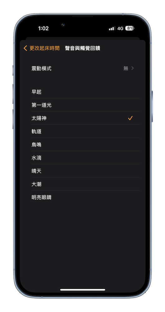步驟 3. 最特別的還是在聲音中 iPhone 為早上起床的氛圍設計了「早起」、「第一道光」、「太陽神」、「軌道」、「鳥鳴」、「水滴」、「晴天」、「大潮」、「明亮眼睛」9 種情境鈴聲。