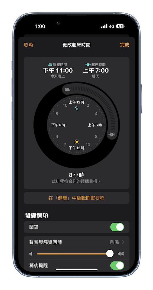 其實除了這 9 種鈴聲能讓我們在睡眠中比較不被驚嚇般起清醒外,還能藉由在「健康」中所設定的睡眠時間來做睡眠追蹤紀錄。
