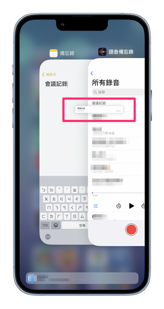 我們只要在「語音備忘錄」中長按住想要加入的錄音檔案,再用另一隻手指把畫面切換到備忘錄,就能直接將錄音檔案拖曳加入備忘錄中。
