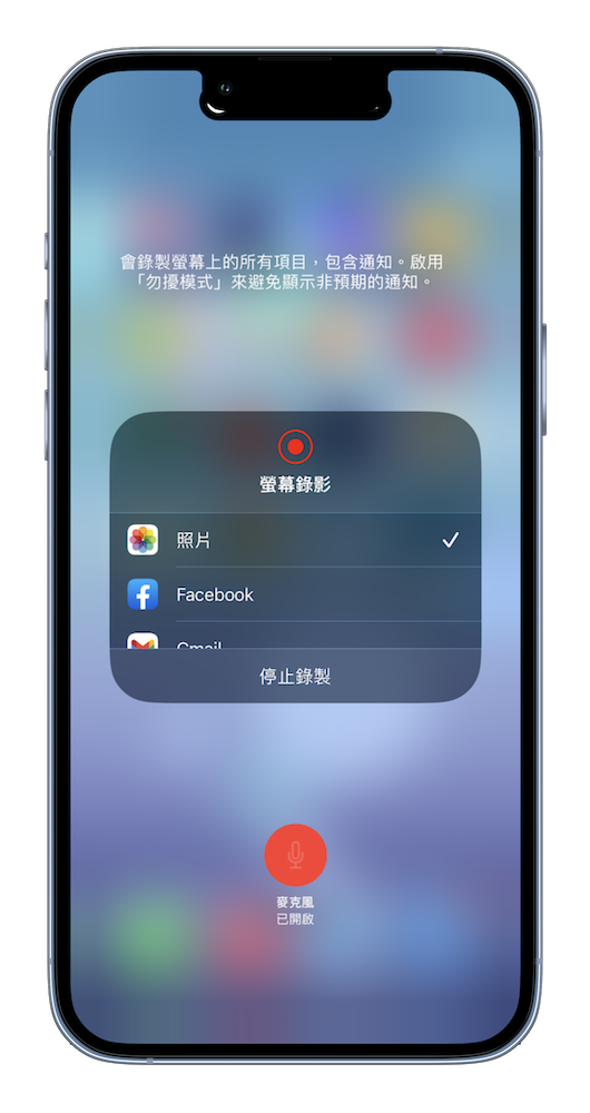 打開手機的控制中心,長按「螢幕錄影」後會選擇「麥克風開啟」,這樣在錄螢幕畫面時就能幫畫面配上自己的聲音,這在製作操作教學錄影的時候是更更容易讓對方理解的。