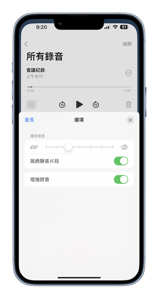 打開「語音備忘錄」後點選任何一個錄音,下方旁邊三條線的工具列,就會出現錄音速度、跳過靜音片段與增強錄音的選項。