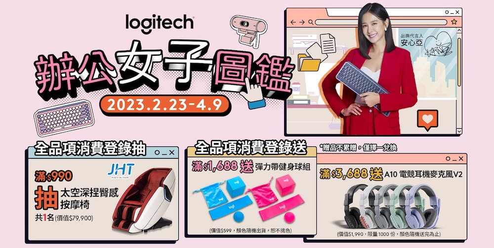 消費者自即日起至 4 月 9 日,於指定通路購買 Logitech 全品項並至指定頁面登錄發票,單筆滿1,688 元就送彈⼒帶健⾝球組 (價值 599 元,送完為止),滿 3,688 元前 1000 名登錄並審核成功者就送 ASTRO A10 電競⽿機⿆克⾵(價值 1,990 元,送完為⽌)。