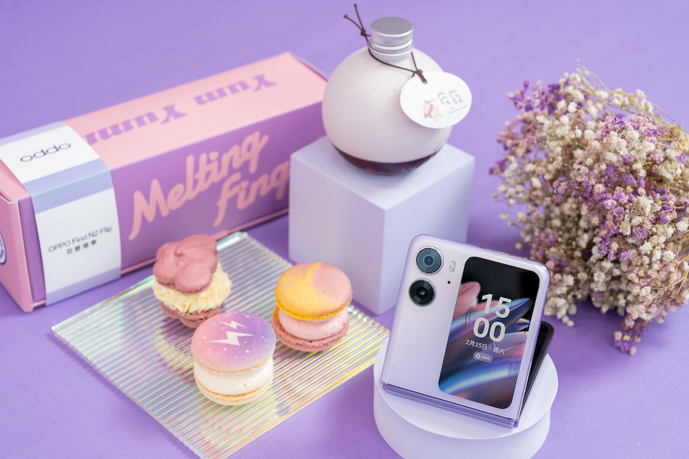 2 月 25 日及 2 月 26 日首兩日 OPPO 也與知名露營音樂季「黑熊部落KUMA TRIBE」合作,邀請多位人氣音樂人於現場不插電演出,更攜手韓國歐巴手作馬卡龍「Melting Finger 舔舔手馬卡龍」,以及療癒系優格飲代表「發發The Far Far Farm」共同推出聯名紫感下午茶組,只要在開展期間來店填寫數位問卷,將有機會免費獲得限量 300 顆的 Melting Finger「大人紫感三刻」馬卡龍乙顆,以及限量 100 杯的發發 The Far Far Farm「紫有為你不葡通優格」優格飲乙杯。除此之外更有機會將全新摺疊手機帶回家!概念店營運期間也推出新機免費體驗活動,只要於現場完成問卷並給付押金即能享受長達 14 天的試用,感受 OPPO Find N2 Flip 百變摺學的魅力!