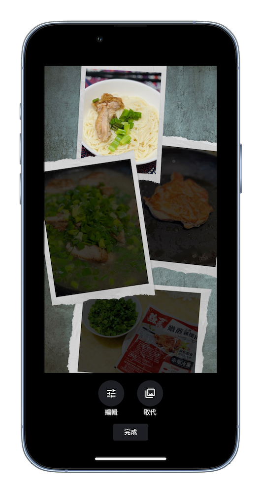步驟 4. 在版型中我們可以長按其中一張照片後來拖曳跟其他張照片交換位置,也能輕點其中一張照片來替換成其他張照片(取代)或是做進一步的編輯(編輯)。