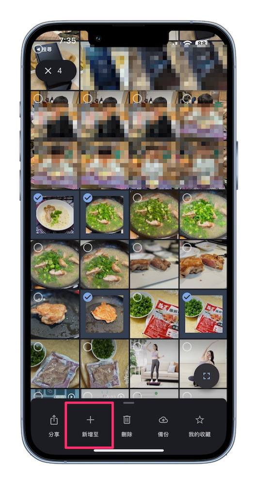 步驟 1. 打開 Google 相簿後在想要進行拼貼的第一張照片長按,之後其他張就用點選的就可以,如果只想要幫一張加背景也可以。選好以後按下的「新增至」。