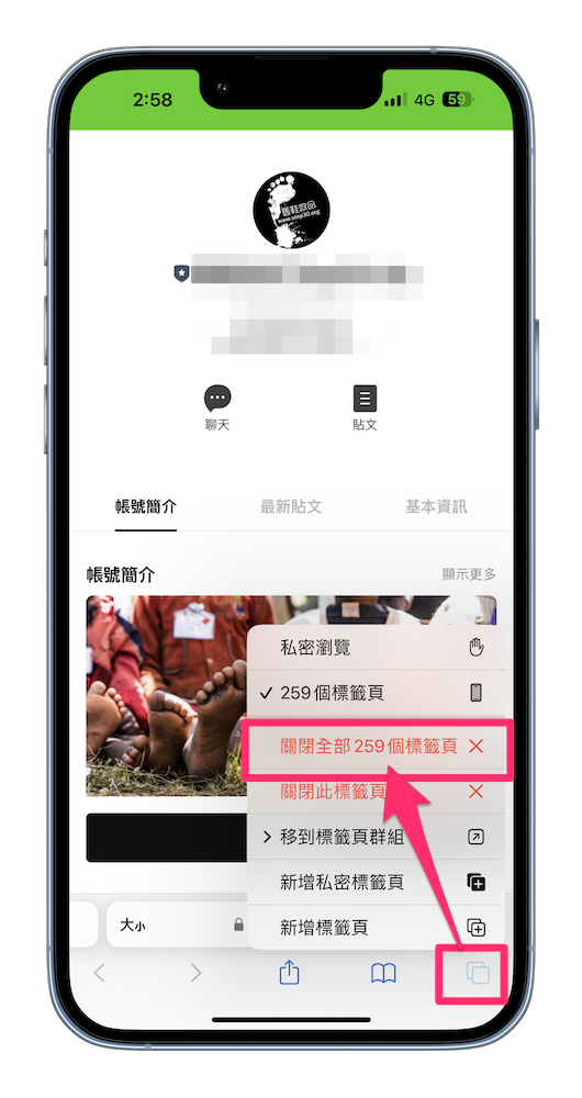 首先打開 safari 的任何一個分頁,長按右下方的「取消」,就會看到「關閉全部 259 個分頁」的選擇,按下去後這 259 個分頁就會瞬間通通關掉。