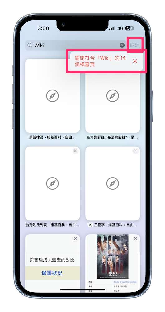 輸入完 「wiki」下方就會自動列出在 259 個分頁中的 wiki 網頁,這時我們長按右邊的「取消」,便會出現「關閉符合『wiki』的 14 個標籤頁」,同樣只要按下去,那 14 個跟 wiki 有關的標籤頁,也就是我們剛剛說的分頁,就會消失囉!