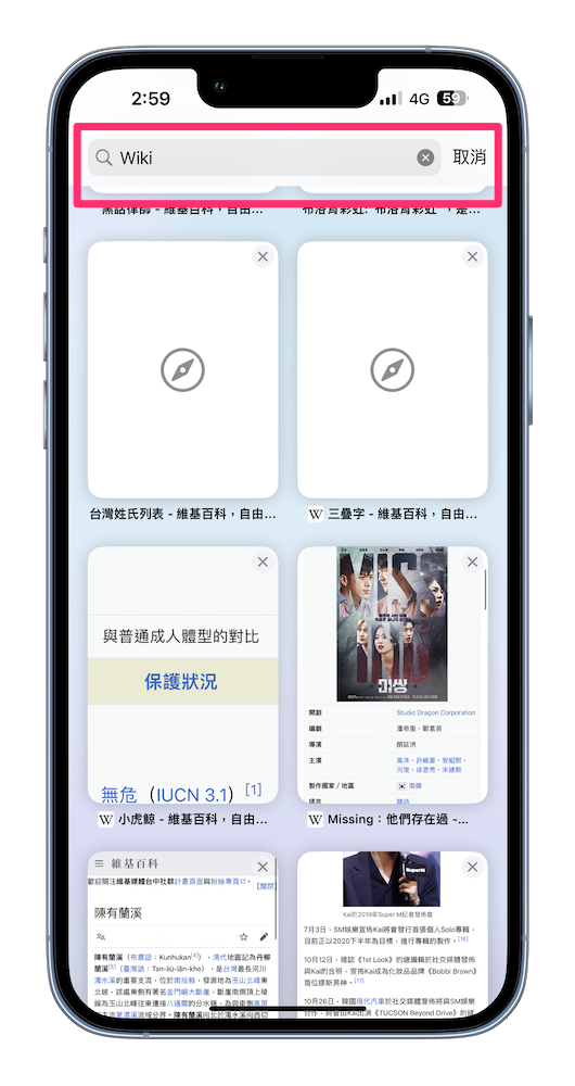 先將 safari 滑到最上方,會看到「搜尋」,在裡面輸入想要關閉分頁的關鍵字,這邊我們就用「wiki」來示範。