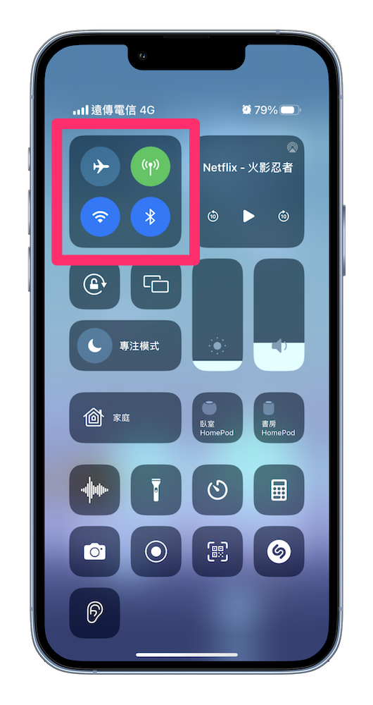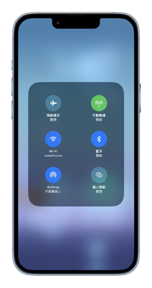 左上角的小方框 – 長按後會發現除了原本「飛航模式」、「行動數據」、「Wi-Fi」、「藍牙」4 個以外,還多了「AirDrop」與「個人熱點」2 個快速開啟選擇。