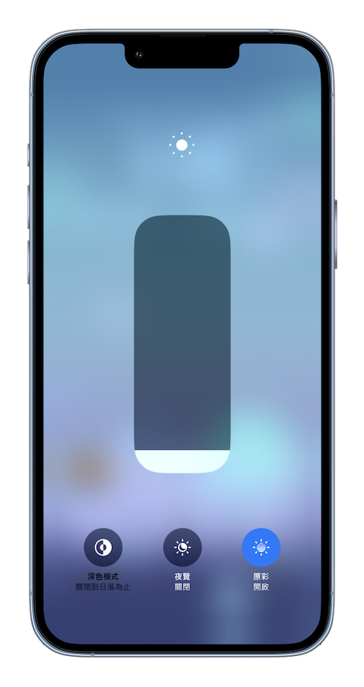 小太陽 – 也就是螢幕亮度,可以上下調整螢幕亮度或是做「深色模式」、「夜覽」、「原彩」等進階的設定選擇。